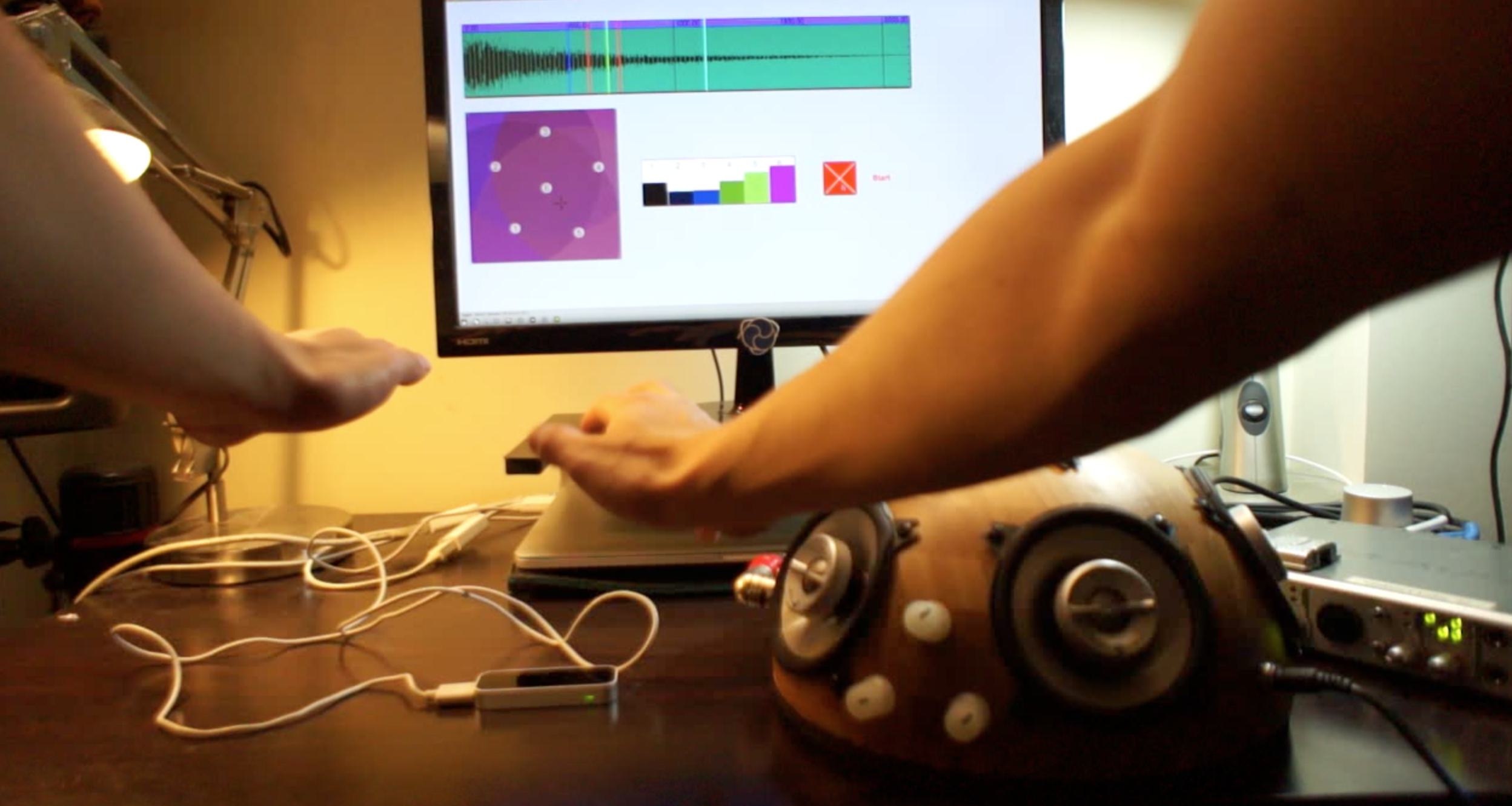 This demo is a culmination of the projects I’ve been working on this past semester. It uses code that I’ve been working on for the Leap Motion for gestural input, a Granular Synthesizer I made in Max and a Hemispherical Speaker that I built.