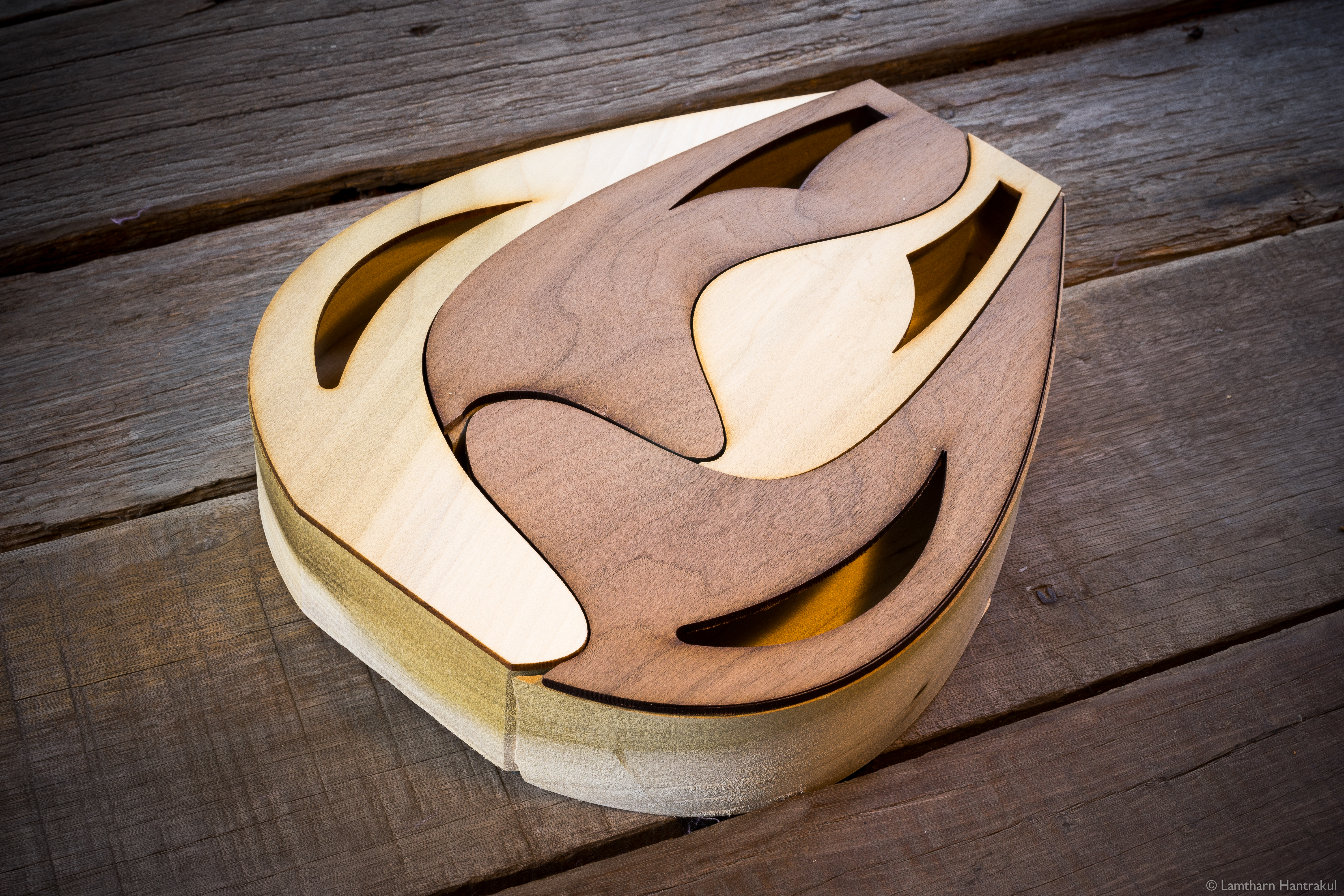 I worked with Dr. Larry Wilen at the Center for Engineering Innovation and Design to mill the resonators I designed for the Super Seung; a re-imagination of the traditional northern Thai guitar.. We used the large ShopBot to cut the 4 chambers into a solid chunk of wood. I used the laser cutter to design the top panel made from materials like acrylic, wood (walnut and birch) and cardboard.
